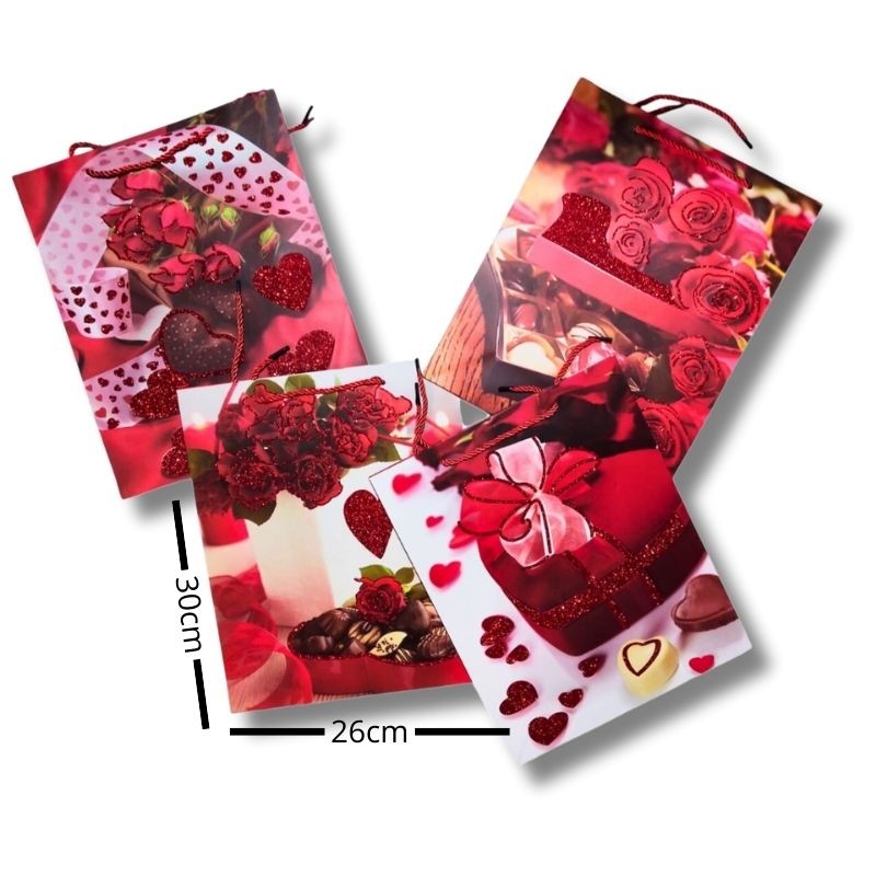 La bolsa con diseño de rosas y chocolates es la elección perfecta para quienes buscan una presentación romántica y elegante para sus regalos. Con unas dimensiones de 26x30 cm, esta bolsa es ideal para empaquetar obsequios de tamaño mediano, como cajas de chocolates, flores o artículos especiales. El diseño presenta una encantadora combinación de rosas y chocolates, evocando sentimientos de amor y cariño, lo que la hace ideal para ocasiones especiales como San Valentín, aniversarios o cumpleaños. Fabricada con materiales de calidad, la bolsa ofrece resistencia y un acabado atractivo que complementa cualquier regalo. Su asa resistente facilita el transporte y asegura que tus obsequios lleguen en perfectas condiciones. Con esta bolsa, cada presente se convierte en una experiencia única, destacando por su diseño romántico y su funcionalidad práctica.